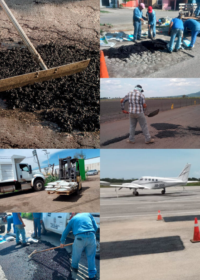 PREPARADO CON ASFALTO ADITIVADO, POLÍMEROS Y PRODUCTOS QUÍMICOS COMPLEMENTARIOS QUE OFRECEN UNA BUENA MANEJABILIDAD, CON UN RENDIMIENTO DE 1 TONELADA DE ASFALTO EN FRÍO SE PUEDE PREPARAR UN ÁREA DE HASTA 20 m2 CON UN ESPESOR DE 5 cm PREFERENTEMENTE PARA SU CORRECTA APLICACIÓN.